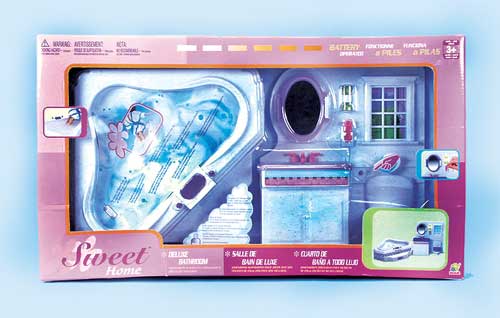 TW3039 Deluxe Bathroom Play Set. Bathroom set has light & accessories, bathroom cabinets, bathtub with motorized blower to make a bubble spa. Requires 4 "AA" batteries. Box size: 21.75"Lx3.75"Wx12.5"H.