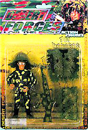 57121 Desert Force. 5" poseable military toy action figure including very large machine gun and camouflage accessories. Assorted styles of figures and accessories. Card size: 11"x7.5". 24 pcs/inner.