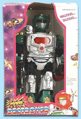 HC909 Destroyer Robot. 8" robot walks & talks. Flashing lights. 2 "AA" batteries not included. Box size: 6"Lx3.75"Wx9"H.