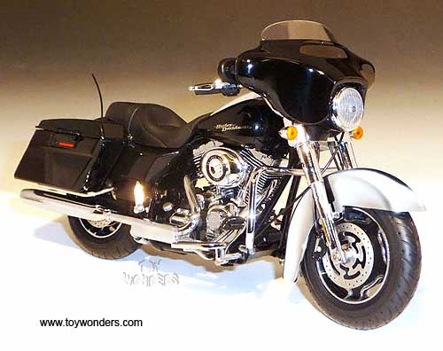 81163 Die-Cast Promotions - 2011 Harley-Davidson FLHX Street Glide Motorcycle. 1:12 scale diecast collectible models. This 2011 Harley-Davidson FLHX Street Glide Motorcycle is approximately 8" long, diecast metal, workable steering, workable/detailed suspension, kickstand. Extremely detailed engine and components. This bike is manufactured by Diecast Promotions. 81163 is in VIVID BLACK & "CHROME FENDER" Color Shop 2-tone colors. Individually packed in a gift box. Mailer box size: 11.5"Lx 7.25"Wx 6"H.