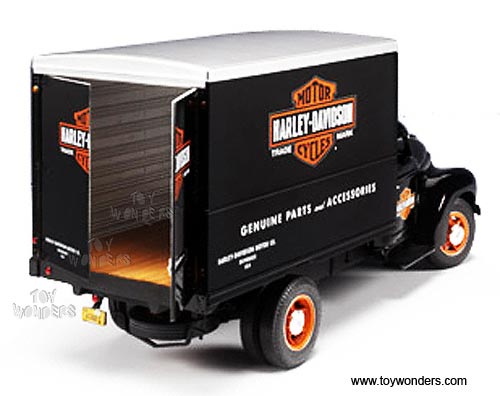 81102 Die-cast-Promotions Harley-Davidson - 1948 International Delivery Truck. 1:16 scale diecast collectible model car. This International Delivery Truck is a 15.5"L x 5"W x 7.5"H die cast metal car with openable hood, side doors & rear doors. This International Delivery Truck is manufactured by Die-cast Promotions. Item 81102 is in BLACK color. Individually packed in a window box. Box size: 18.5"L x 9"W x 10"H.