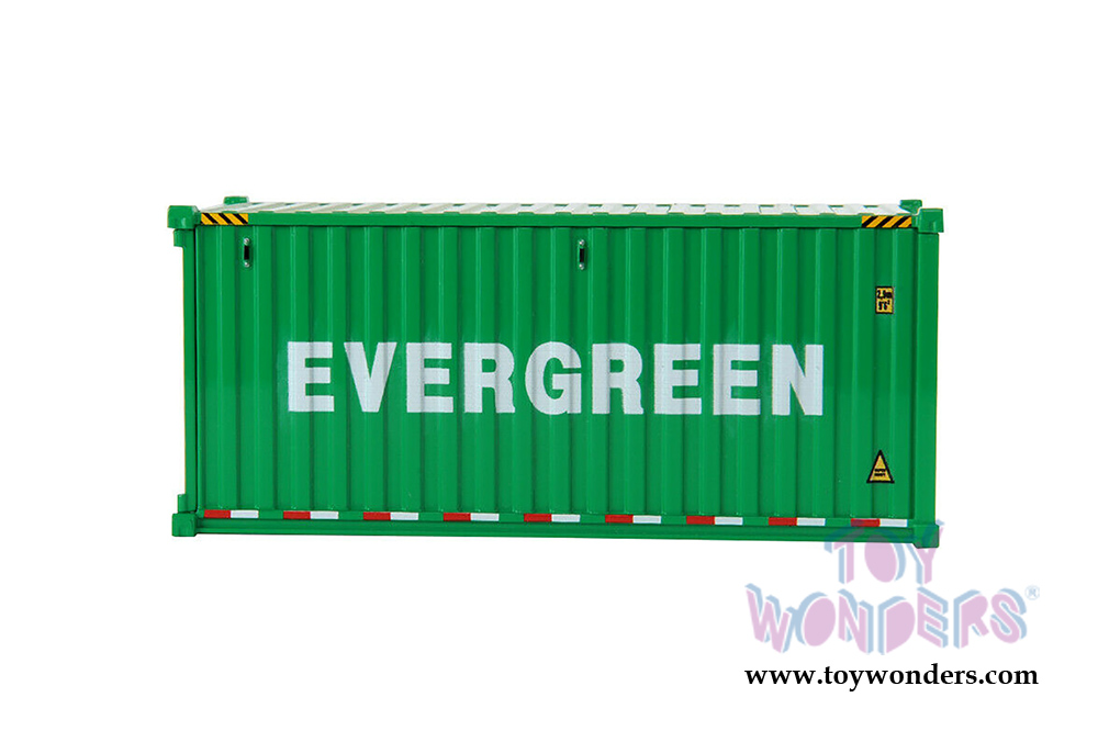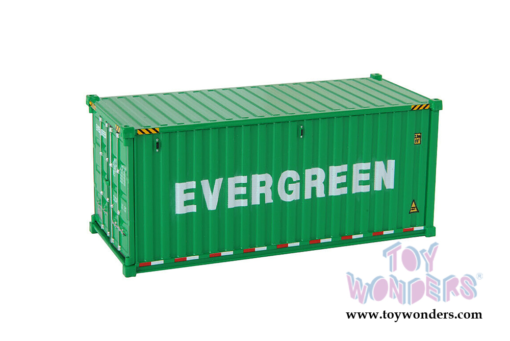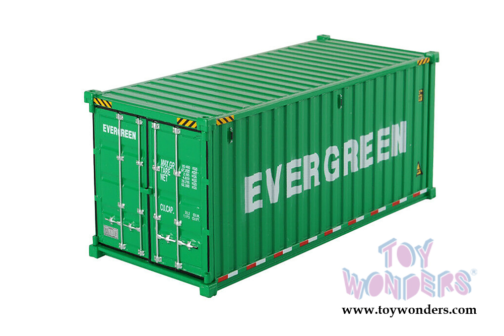 91025D Diecast Masters - 20' Dry Goods Sea Shipping Container "Evergreen" - Transport Series. 1:50 scale diecast collectible model. This Container is a 4¾"L x 2"W x 2"H plastic model. The container is plastic not diecast metal. Manufactured by Diecast Masters. Transport Series items come in specially designed, slide-style cardboard boxes with full-color outer sleeves. Die-Cut foam insert protects the model within the box. The cardboard outer box provides additional protection. Box measures 6.5"L x 3"W x 3"H. 91025D is in Green.