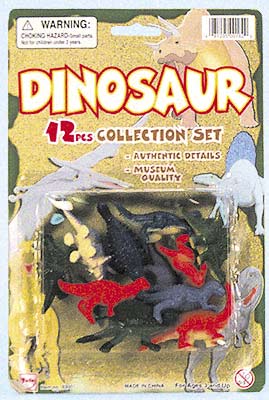 80258 Dinosaur. 12 piece dinosaur collection includes many different species of dinosaurs such as tyrannosaurus, pterodactyl, and others. Dinosaurs come in assorted colors. Card size: 9"x6". 36 pcs/inner. Dollar item.