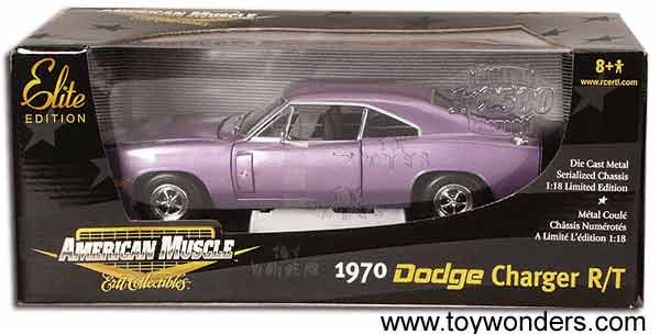 33982PU ERTL Dodge Charger R/T (1970). 1:18 scale diecast muscle car. Opening hood & doors. This 1970 Charger R/T is made by American Muscle -RC2 Brands.33982 in Color is called Plum Crazy. PURPLE color.