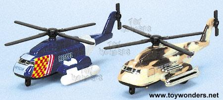 601D Dragon Fly Helicopter, 6" long, diecast metal helicopter with pullback motor action, opening doors, and rotating chopper. These toy copters come 12 pcs per display box. 601 in assorted colors. 60 pcs per inner box. ZM2