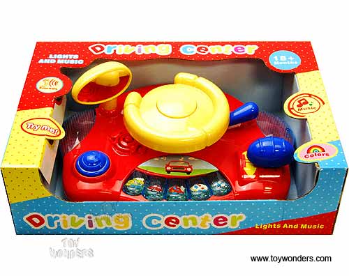 5017 Driving Center with Lights & Sounds. 11.5" interactive Driving Center features turnable steering wheel with horn, flashing lights, 5 keys keyboard with different vehicle sounds (police car, ambulance, fire engine, car & t-r-a-i-n) and music (5 melodies), button with starting engine sound, and shift gear with acceleration sound. Includes 2 "AA" batteries. Box size: 14.25"L x 9.5"W x 4.25"H. 9 pcs per inner box. For 18 months and up.