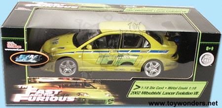 33448 ERTL - Racing Champions "2 Fast 2 Furious" 2002 Mitsubishi Lancer Evolution VII from the Summer 2003 sequel to "The Fast and the Furious" Scale: 1:18 Dimensions: 9.25"L x 3.75"W x 2.5"H Mitsubishi die cast metal sports car with opening doors, hood, and trunk, and workable steering. Detailed engine & components. Free wheeling. Sits on display stand with movie logo. Import Tuner car. Box: 13.5"W x 5"H x 6.25"D Manufactured by RC2 Brands Color: Metallic yellow