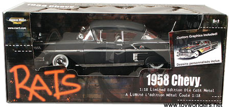 33706BK ERTL American Muscle 1958 Chevy Bel Air. 1:18 scale diecast model car. 1958 Chevrolet Belair diecast metal with opening doors/hood and detailed engine & components. This 1958 Chevy Bel-Air is manufactured by RC2 Brands. Individually packed in a window box. 33706 in FLAT BLACK color.