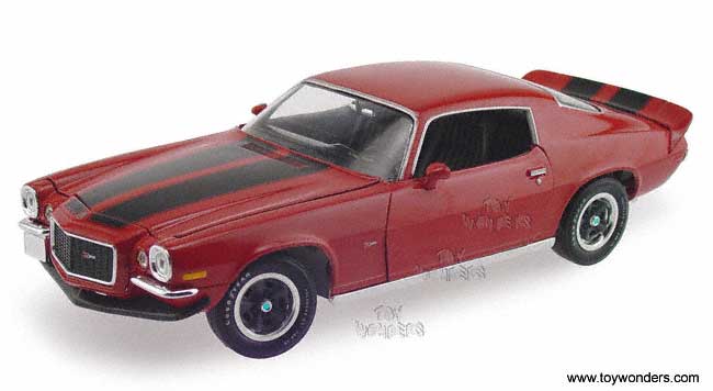 33977R ERTL - American Muscle 1973 Chevy Camaro Z-28. 1:18 scale diecast model car. This 1963 Camaro Z 28 features opening hood & doors. Black stripes too. 33977 in RED color.