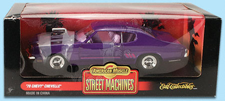 7980PU ERTL-American Muscle - 1970 Chevrolet Chevelle. 1:18 scale diecast collectible model car. This 1970 Chevy Chevelle is 10.5"Lx 3.75"Wx 3"H diecast collectible muscle car with opening doors & hood, steerable wheels, custom paint & decoration, detailed V-8 engine with supercharger, and lowered stance. This 1970 Chevelle is from RC2 Brands' Street Machine line of muscle cars. 7980 in PURPLE color.
