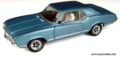 33774BU ERTL Collector American Muscle - 1970 Oldsmobile Cutlass SX Hard Top. 1:18 scale diecast model car. American Muscle Collector Edition vehicles represent the epitome of true muscle. Each replica is modeled after one of the most exciting vehicles in American automotive history, and includes opening hoods and doors, with detailed engines and interiors. You'll appreciate the authenticity and quality of these 1:18 scale replicas. This 1970 Olds in manufactured by RC2 Brands. Individually packed in a window box. 33774 in BLUE color. GM is a trademark of the General Motors Corporation.