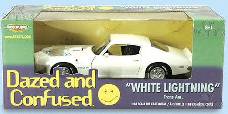 33120 ERTL - American Muscle "White Lighting" (1973) Pontiac Trans Am from the movie "Dazed and Confused". 1:18 scale diecast model car. This 1973 Pontiac Trans Am is a 10.75" long x 4"W x 3"H diecast metal with opening doors/hood, workable steering, folding seats, firebird logo on hood, and BFG tires. Detailed engine & components. Sits on display stand. This 73 Pontiac Trans Am is manufactured by RC2 Brands. Individually packed in a window box. Box is 13.5"W x 5.25"H x 6.25"D. WHITE color.