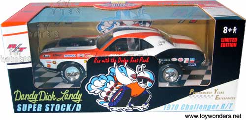 29153A ERTL - American Muscle Performance Years Enterprises 1970 Dodge Challenger R/T Scale: 1:18 1970 Challenger Dandy Dick Landy Super Stock/D Limited Edition. Die cast metal collectible features sponsors and Firestone Drag 500 tires. Manufactured by RC2 Brands Individually packaged in window box Color: Pearl white with orange & black stripes and black interior