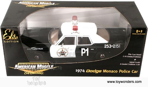 39316BK ERTL American Muscle 1974 Dodge Monaco Police Car. 1:18 scale diecast model car. 12.25" long x 4"W x 3.5"H die cast car with opening doors/hood/trunk, steerable front wheels and detailed interior & chassis. Limited edition. Manufactured by American Muscle. RC2 Brands. 39316 in BLACK color. Individually packed in a window box. Box size: 13.75"L x 6.25"W x 5.75"H.