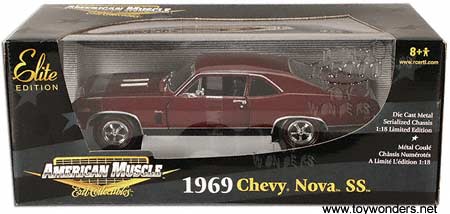 33970BG ERTL Elite American Muscle - 1969 Chevy Nova SS Hard Top. 1:18 scale diecast model car. This 1969 Chevrolet Nova SS is a 10" long diecast metal with opening doors/hood/trunk. Elite Limited Edition. 1 of 5,000 pcs. This 69 Chevy Nova SS is manufactured by American Muscle. ERTL. RC2 Brands. Individually packed in a window box. 33970 in BURGUNDY (maroon) color.