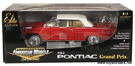 33915R ERTL American Muscle Pontiac Grand Prix (1962). 1:18 scale diecast model. This 1962 Pontiac Grand prix is an 11" long diecast metal car with opening doors/hood/trunk. Elite Limited Edition 1 of 5,000 pcs. This 62 Pontiac Grand Prix is manufactured by RC2 Brands. RED with white top.