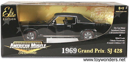 33725BK ERTL Elite American Muscle - 1969 Pontiac Grand Prix SJ428. 1:18 scale diecast model car. This 1969 Pontiac Grand Prix SJ428 is a 10" long diecast car with opening doors/hood/trunk and detailed engine and component. Display platform. Limited Elite Edition 1 of 5,000 pcs. This 69 Pontiac Grand Prix is manufactured by American Muscle. RC2 Brands. Individually packed in a window box. 33725 in BLACK color.