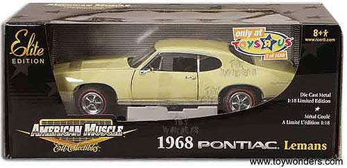 39287YL ERTL Elite American Muscle - 1968 Pontiac Lemans Hard Top. 1:18 scale diecast model car. Opening hood & doors. Limited Elite Edition 1 of 1650 pcs. Black interior. Red line tires. RC2 ref. no. 39287 & 37430. Pale YELLOW color (BEIGE like color). Individually packed in a window box. GM is a trademark of the General Motors Corporation.