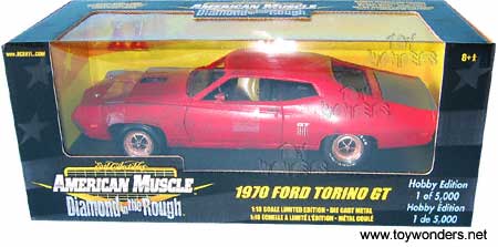 36683R ERTL - American Muscle 1970 Ford Torino GT. 1:18 scale diecast model car. American Muscle Diamond in the Rough. This 1970 Ford Torino is a Limited Hobby Edition 1 of 5000 pcs. This 70 Ford Torino is a 11.5" long diecast metal car with workable steering, Good Year tires, and opening doors/hood. Display platform. RC2 Brands. Individually packed in a window box. 36683 in RED color.