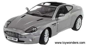 33849SV/6 ERTL Joyride American Muscle - James Bond Aston Martin V12 Vanquish. 1:18 scale diecast collectible model car. This 007 James Bond spy car features Q-card CD ROM, retractable front grille to expose rockets and machine guns. Sliding intake covers, retractable guns that pop through the intake openings, passenger ejector seat (very important feature to have when travelling with annoying people), opening hood with detailed engine, opening doors with detailed interior, removable roof, opening trunk. RC2 Brands. Individually packed in a window box. 33849 in SILVER color.