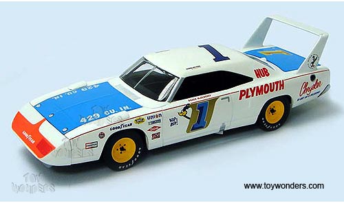 29530W ERTL Mopar - Plymouth Superbird Race Car #1 Roger Mccluskey. 1:18 scale diecast collectible model car. This Plymouth Superbird Racing Car is an 11.75"L  die cast metal car with openable doors & hood, detailed interior & chassis, steerable front wheels, and limited edition numbered series. Sits on a display stand. This 1970 Plymouth Superbird is manufactured by RC2 Brands. 29530 is in WHITE color with Blue hood & trunk. Individually packed in a window box. Box measures 13.75"L x 6.25"W x 5.75"H.