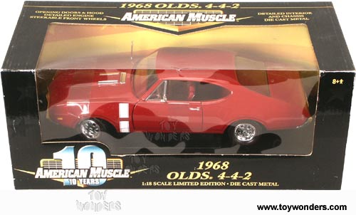 36420AR ERTL - American Muscle 1968 Oldsmobile 4-4-2 Hard Top. 1:18 scale diecast collectible model car. 11.25" long x 4.5"W x 2.75"H, die cast metal classic muscle car with opening hood & doors, detailed engine, steerable front wheels, detailed interior & chassis. 10 years American Muscle. Sits on a display platform. This 1968 Olds 442 is manufactured by the RC2 Brands. Individually packed in a window box. Box measures 13.75"Lx 6.25"Wx 5.75"H. 36420A in RED color.