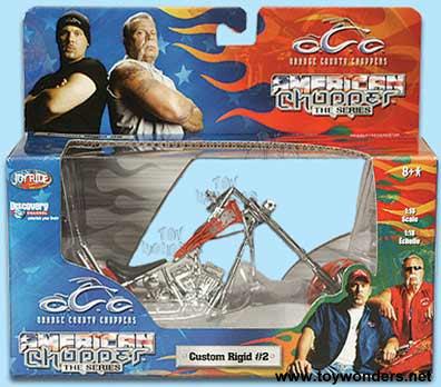 37168D ERTL Orange County Chopper. 1:18 scale. 6.5" long diecast metal bike/motorcycle with superior detail, and over 50 parts. Assorted styles: Jet Bike, Mikey's Bike, Custom Rigid #2. OCC. Joy Ride. American Chopper.