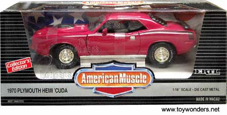 7375PR ERTL Plymouth Hemi 'Cuda (1970). 1:18 scale. American Muscle collector's edition. Color is called Moulin Rouge. It's a magenta/pinkish color car with black spoiler, rear window louvers, and interior. Good Year tires. Case pack: 6 pcs. $33.00/pcs. PINK color.