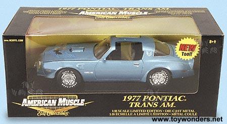 36673JU ERTL - American Muscle 1977 Pontiac Trans Am T-Top. 1:18 scale diecast model. This 1977 Pontiac Trans-Am is a 10.5" long x 4"W x 2.75"H diecast metal classic muscle car with workable steering, free wheels, folding seats, Good Year tires, Firebird logo on hood and sides, and opening doors/hood. Highly detailed engine & components. Sits on a display platform. Individually packed in a window box. Box measures 13.5"W x 5.75"H x 6.25"D. American Muscle Classics. RC2 Brands. 36673 in BLUE color.