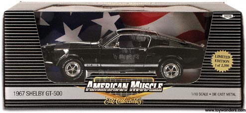 39228BK ERTL - American Muscle 1967 Shelby GT500. 1:18 scale. 10" die cast classic car, opening doors/hood, detailed interior/chassis/engine, steerable front wheels. Limited Edition 1 of 2,500. 39228 BLACK with white stripes