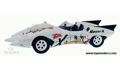 33403 ERTL - American Muscle car. "Speed Racer" Mach 5 Special Edition. This is the 35th anniversary edition of Speed's car from the classic cartoon and features images of the masked Racer X on the hood, trunk, and sides. 1:18 scale, 10.75" long x 4"W x 2.5"H. Opening doors/hood/trunk with workable steering. Special features include periscope compartment, robot bird probe compartment, extending auto jacks, rotary saws. Highly detailed components including multi-button steering wheel. Sits on a display stand. Manufactured by RC2 Brands. Individually packed in a window box. Box size is 13.5"L x 6.25" x W5.25"H. 33403 in WHITE color.