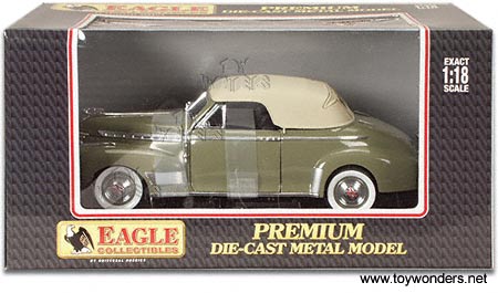 4353 EAGLES RACE 1941 Chevrolet Deluxe Scale: 1:18 Dimensions: 10.5"L x 3.5"W x 3.5"H 1941 Chevy Deluxe die cast soft-top convertible with opening doors and hood. Display platform included. Individually packaged in a window box Color: Olive