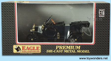 4303BU EAGLES RACE Ford Model T. 1:18 scale diecast model. This Ford Model T is an 8.25"L x 3"W x 3"H diecast convertible with opening doors/hood and workable steering. Display platform. This Ford Model T is manufactured by Eagles Race. BLUE color.