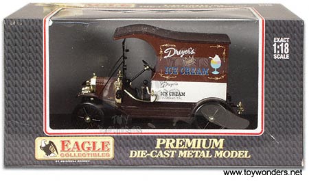 4305CM EAGLES RACE Ford Model T. 1:18 scale diecast model car. This is an 8"Lx 3.25"Wx 4.25"H diecast Dryer's Ice Cream truck with opening doors/hood. Display platform. The first production Model T Ford was assembled at the Piquette Avenue Plant in Detroit on October 1, 1908. Over the next 19 years, Ford would build 15,000,000 automobiles with the Model "T" engine, the longest run of any single model apart from the Volkswagen (VW) Beetle. From 1908-1927, the Model T would endure with little change in its design. Henry Ford had succeeded in his quest to build a car for the masses. Manufacturer ref. no. 4305 in BROWN color. Individually packed in a window box.