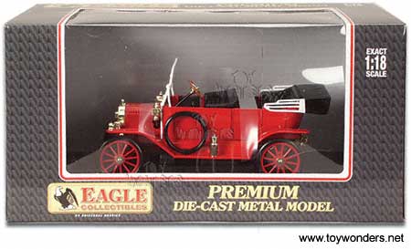 4302E EAGLES RACE Ford Model T convertible. 1:18 scale diecast model car. This Ford Model T is an 8.25"L x 3"W x 3"H diecast convertible with opening doors/hood and workable steering. Black color interior with display platform. The first production Model T Ford was assembled at the Piquette Avenue Plant in Detroit on October 1, 1908. Over the next 19 years, Ford would build 15,000,000 automobiles with the Model "T" engine. This represents the longest run of any single model apart from the Volkswagen (VW) Beetle. From 1908-1927, the Model T would endure with little change in its design. Henry Ford had succeeded in his quest to build a car for the masses. This Ford Model T is manufactured by Eagles Race. Manufacturer ref. no. 4302 in RED color. Individually packed in a window box.