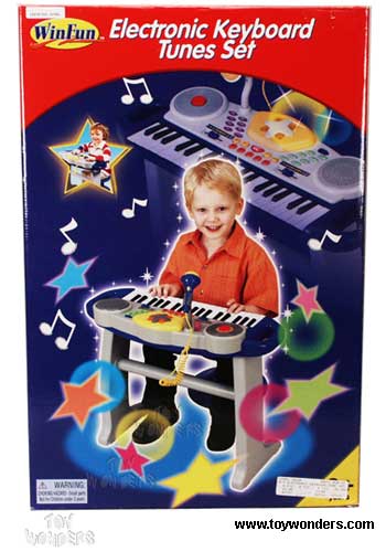 2038K/3 Electronic Keyboard Tunes Piano Set. 18" tall set include keyboard with 37 keys, detachable microphone, DJ scratch disc with 5 sound effects, 8 instrument selection, 8 rhythm selection, 5 drum sounds, rec/playback, tempo/volume adjuster, built-in handle, stand and stool. Requires 4 "AA" batteries. Box size: 16"Lx 6"Wx 23.75"H.
