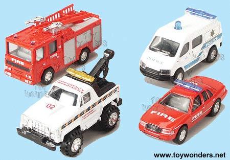 9880/12D Emergency Series. This emergency vehicle is a 3.5" - 4" diecast metal with pull back motor action. Assorted in fire truck, city police, tow truck, construction vehicle, ambulance, etc. 12 pcs per display box in assorted styles.  72 pcs per inner box.