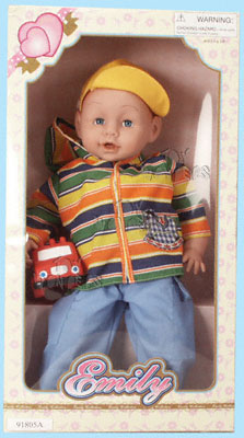 91805A Emily Fire Truck Doll. 18" stuffed boy doll in striped jacket, cargo jeans, & yellow cap. Holding fire truck. box size: 11"Lx5"Wx20"H.