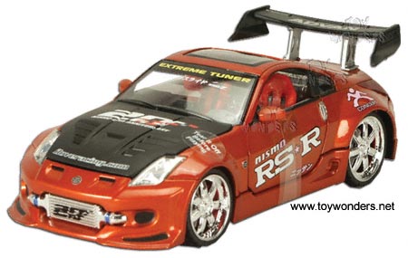 39356 Extreme Tuner Nissan 350Z Fairlady. 1:24 scale. 7.5"L diecast model sports car with opening doors/hood. This sporty Nissan 350-Z race car have special light up features for the headlights, interior, and chassis (lights stay on for few seconds each time). Display of 4 pcs and in assorted colors. 12 pcs per inner box. This Nissan 350 Z is manufactured by Boley; ref. no. 39356.
