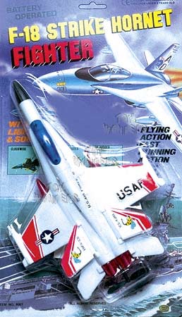 8001 F-18 Strike Fighter (flying). 11" long battery operated fighter jet that flies around on a string. Lights & Sound action. Assorted colors. Requires two "AA" batteries. Blister card size: 9"x 5". 12 pcs/inner.
