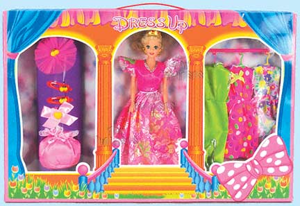 11381/1 Fashion Doll. 11.5" fashion doll. Includes three extra dresses, dress rack, and hair accessories. Musical version plays a popular melody. Box size: 19.75"Lx2"Wx13"H. 6 pcs/inner.