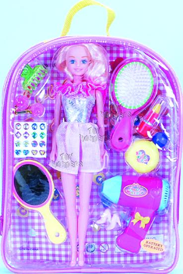 4225/24 Fashion Doll Play Set. Fashion doll set with 11.5" doll in a back pack with beauty accessories, a dryer. Requires 1 "AA" battery. Package size:9"Lx 2"Wx 12"H.