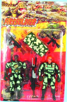 33049 Fire Soldier. Two 7" army soldier dressed in camouflage, mini army vehicle, machine guns, and more. card size: 10.5"x16.5". 12 pcs/inner.