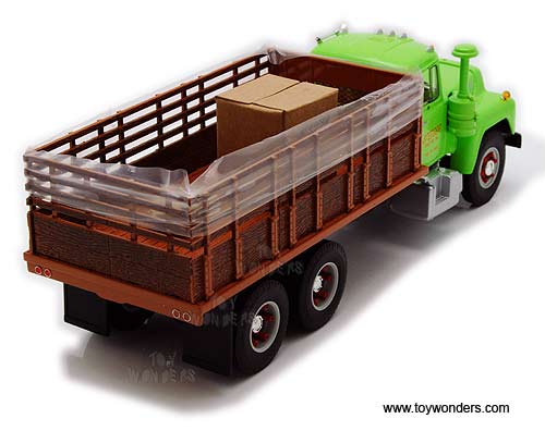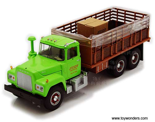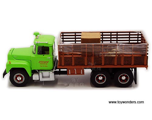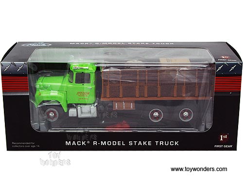 19-3914 First Gear Agriculture - Steiger Mack R-model Stake Truck with Load. 1:34 scale diecast collectible model. This Mack R-model Stake Truck is a 9.25"L x 3.25"W x 3"H diecast model. Manufactured by First Gear. 19-3914 is in GREEN color. Individually packed in a window box. Box size: 11.5"L x 4.5"W x 4.5"H.