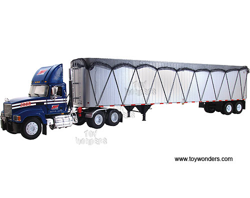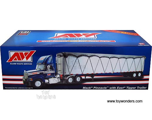 18-3736 First Gear Allied Waste - Mack Pinnacle with Tipper Trailer & Netting. 1:34 scale diecast collectible model. This Mack Pinnacle tractor trailer is a 22.75"L x 3"W x 5"H die-cast metal car. This Mack Pinnacle is manufactured by First Gear. 18-3736 is in BLUE color. Individually packed in a box. Box size: 20"L x 9.75"W x 6.5"H.