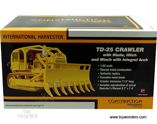40-0208 First Gear Construction Pioneers - International Harvester TD-25 Crawler with Clearing Blade & Winch. 1:25 scale diecast collectible model. This International Harvester TD-25 Crawler is a 11.5"L x 6"W x 5"H die-cast metal car. Manufactured by First Gear. 40-0208 is in YELLOW color. Individually packed in a box. Box size: 14.5"L x 9.5"W x 7.75"H.