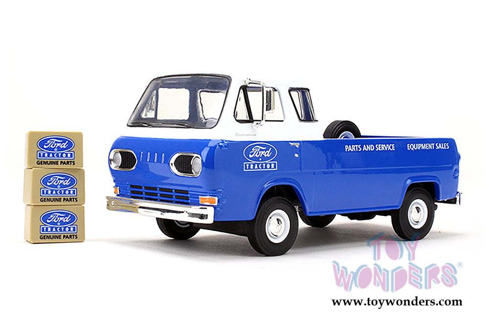 40-0395 First Gear - Ford Tractor Parts and Service 1960 Ford Econoline Pick-Up with Three Boxes. 1:25 scale diecast collectible model. This Ford Pick Up Truck is a 6.5"L x 3"W x 3"H die-cast metal car. Manufactured by First Gear. Item 40-0395 is in BLUE and White colors duo-tone colors. Individually packed in a window box. Box size: 8.75"L x 4.5"W x 4.5"H.