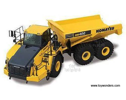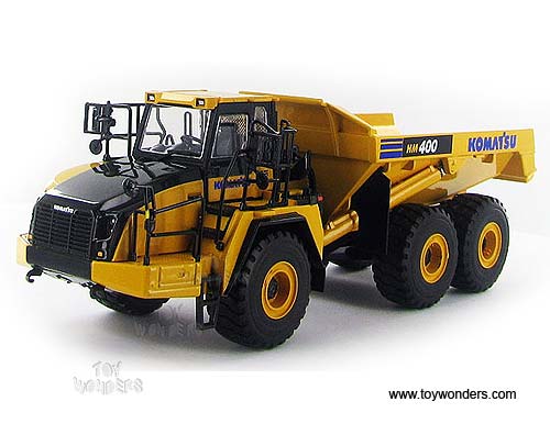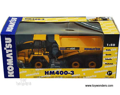 50-3255 First Gear - Komatsu HM400-3 Dump Truck. 1:50 scale diecast collectible model. This Komatsu HM400-3 Dump Truck is an 8.75"L x 3.25"W x 3"H die-cast metal model. Manufactured by First Gear. 50-3255 is in YELLOW color. Individually packed in a window box. Box size: 10.25"L x 5"W x 4.5"H.
