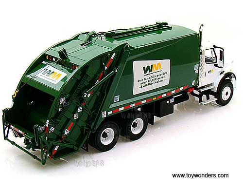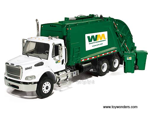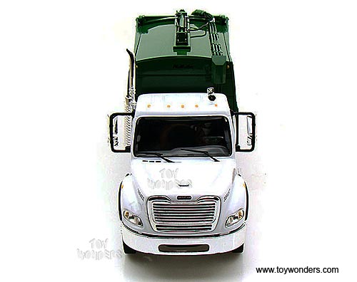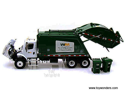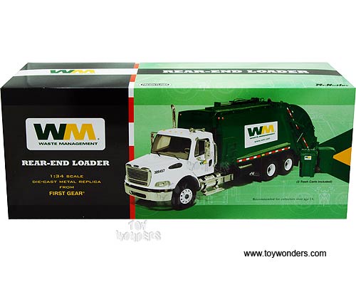 10-3287T First Gear Waste Management - Freightliner M-2 Rear Load Refuse Truck with Bins. 1:34 scale diecast collectible model. This Freightliner M-2 Rear Load Garbage Truck is a 12"L x 3.5"W x 4.25"H die-cast metal car with openable hood, functioning trash cart tipper mechanism, detailed engine and cab interior. This Freightliner M-2 Rear Load Refuse Truck is manufactured by First Gear. 10-3287T is in WHITE color with Green rear load refuse truck. Individually packed in a box. Box size: 18"L x 5.75"W x 7.5"H.