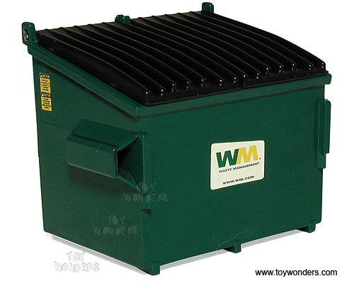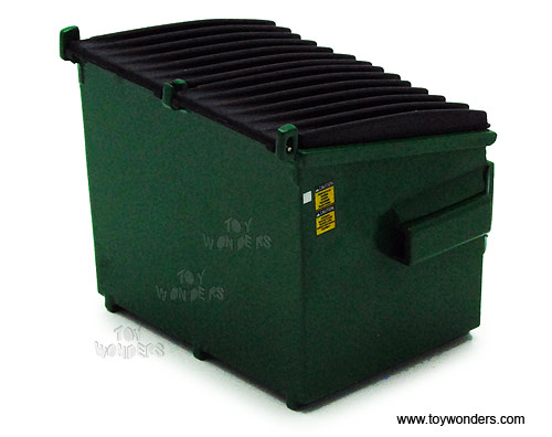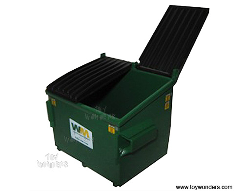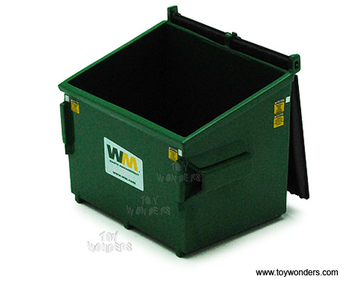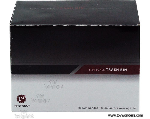 90-0169 First Gear Waste Management - 1:34 Scale Trash Bin. Great for decorating 1:34 scale cars, buildings and dioramas. This Refuse Bin is 2.5"L x 1.75"W x 2"H diecast model. Manufactured by First Gear. 90-0169 is in GREEN color. Individually packed in a box. Box size: 4"L x 2.5"W x 2.75"H.